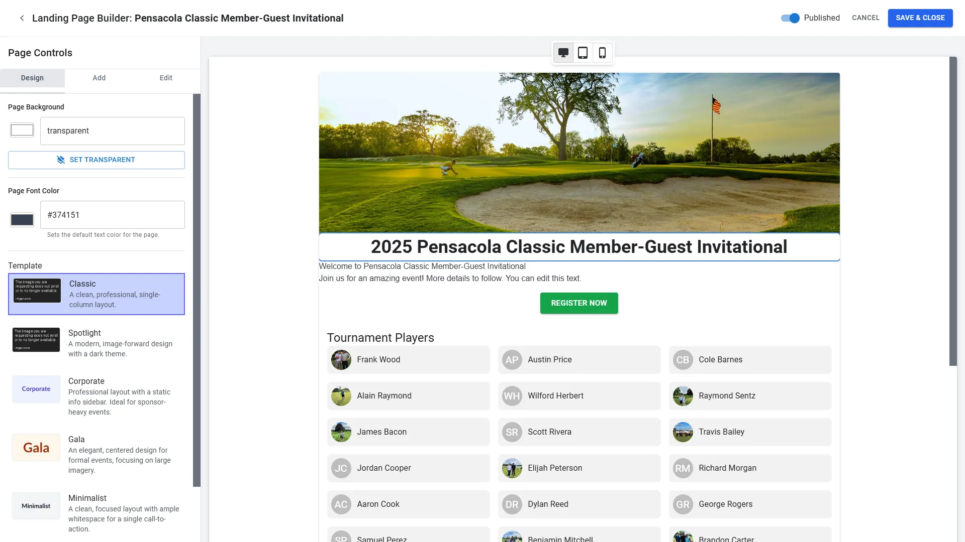 Connect event data such as players, sponsors, and leaderboards directly to your landing pages for a real-time experience.