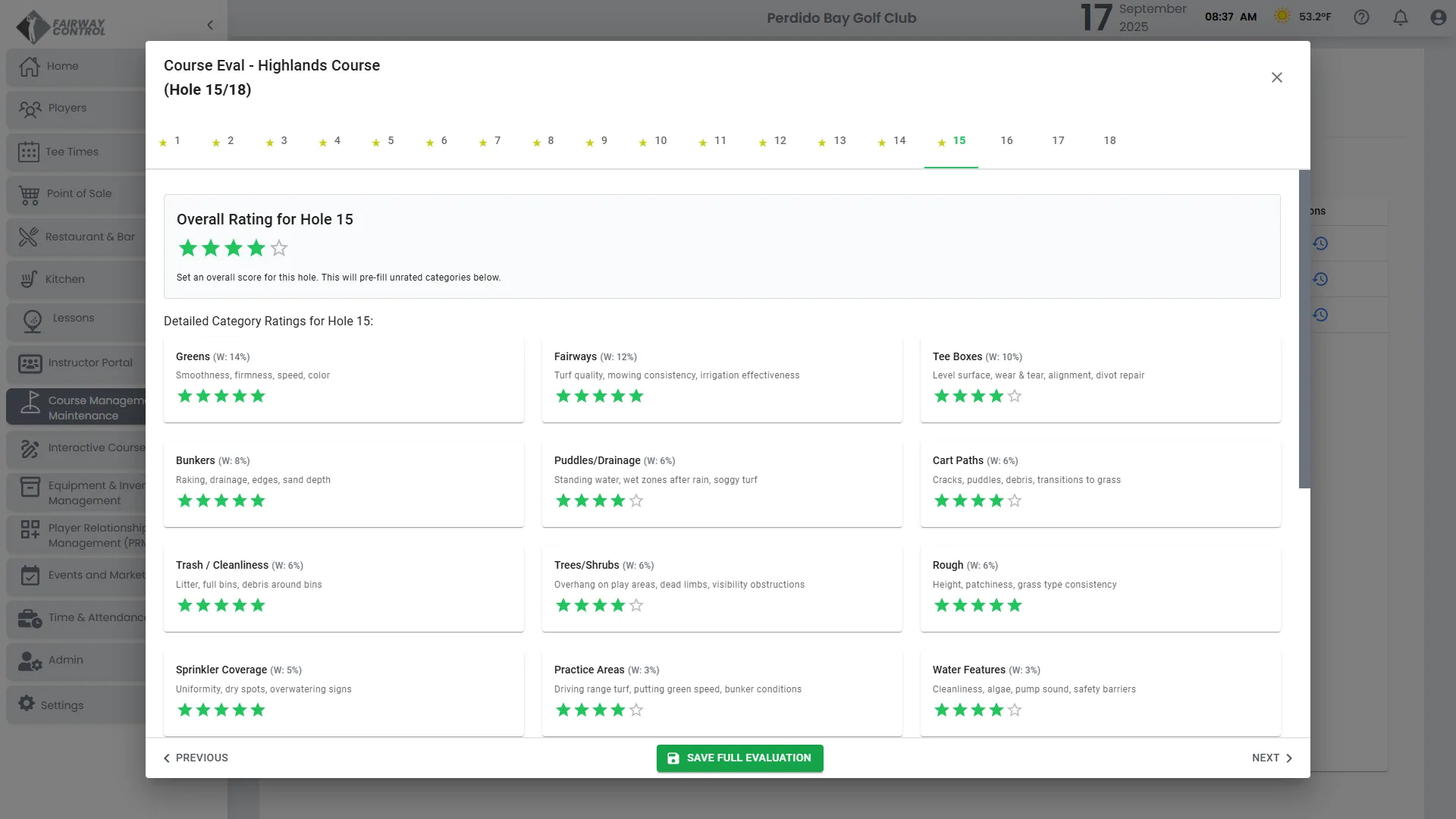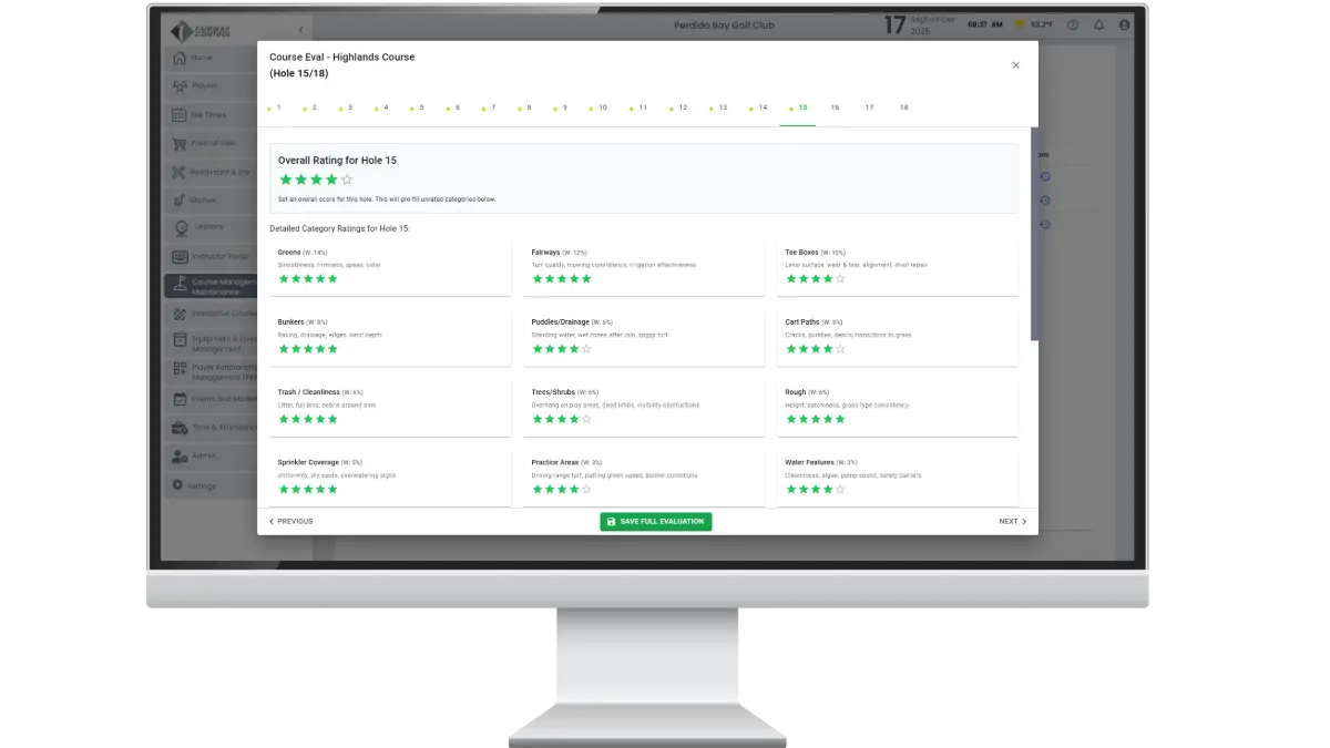 Evaluate greens, fairways, bunkers, and more with structured scoring. Weighted categories focus attention where it matters most. Daily insights help superintendents improve playability and consistency.