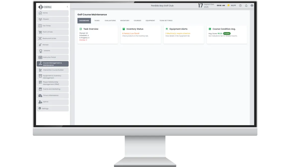 View your entire course operation in one dashboard. Track tasks, equipment status, inventory levels, and course conditions with real-time updates. Designed for quick planning, it keeps staff organized and operations smooth.