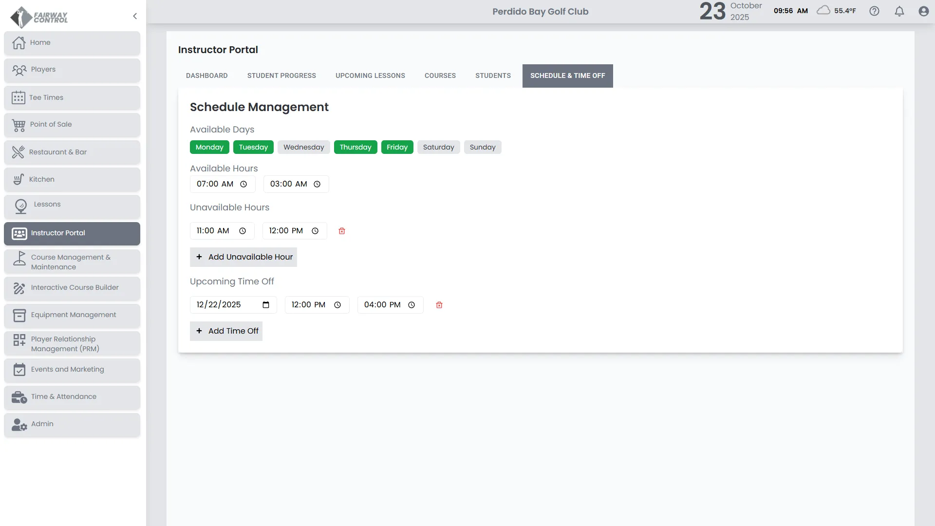 Set available hours, off days, and recurring schedules. Instructors stay organized and avoid double-booking.