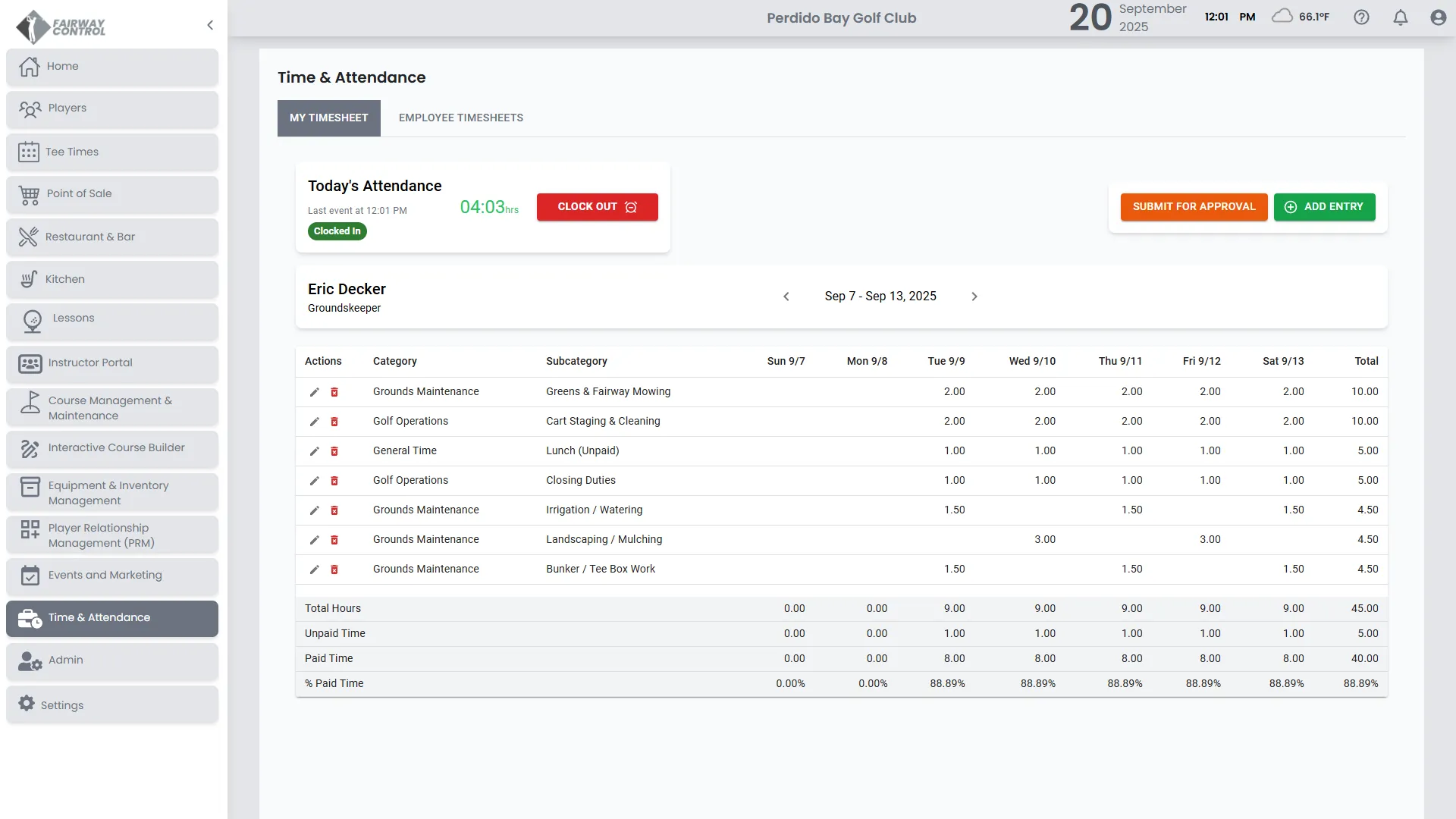 Employees track hours directly in the system, removing the need for paper or spreadsheets. Weekly time cards are submitted for manager approval, keeping records clear and accurate.