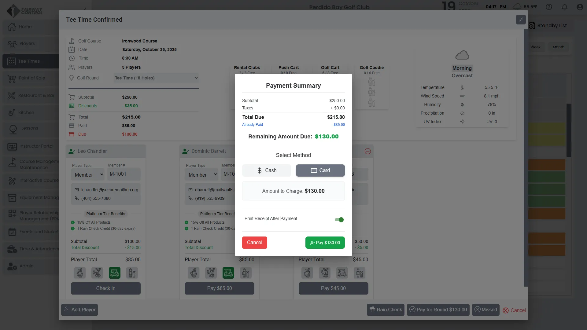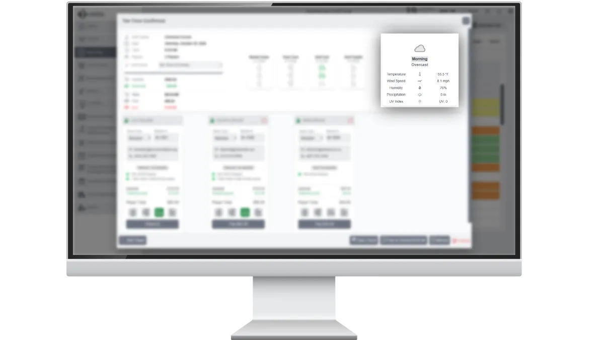 Stay ahead of conditions with live weather built into your tee sheet. Forecasts and alerts help staff adjust schedules confidently. Players enjoy smoother rounds with fewer disruptions.