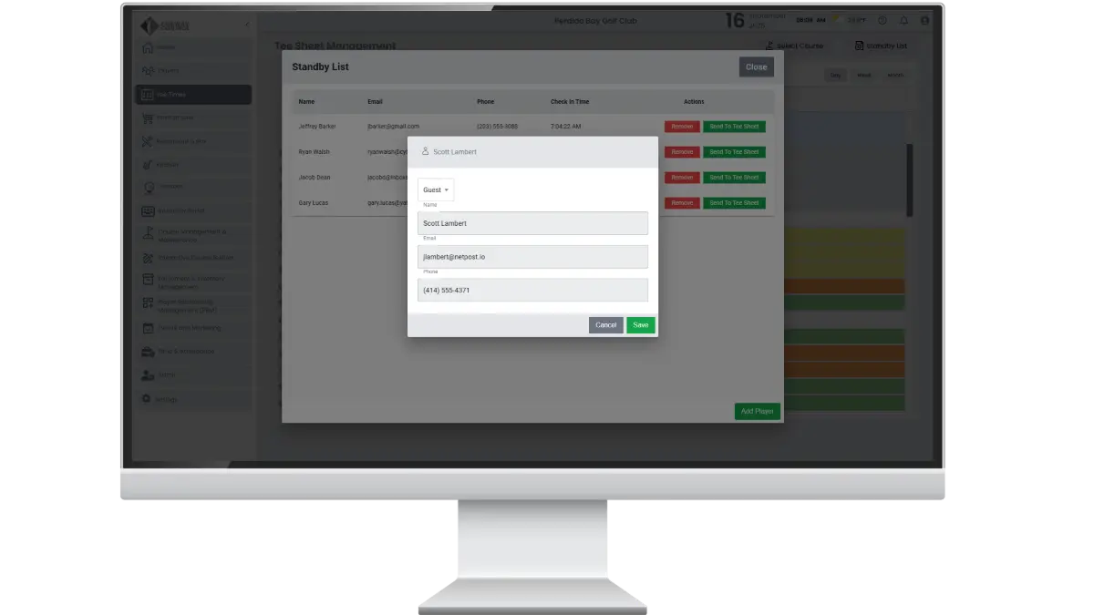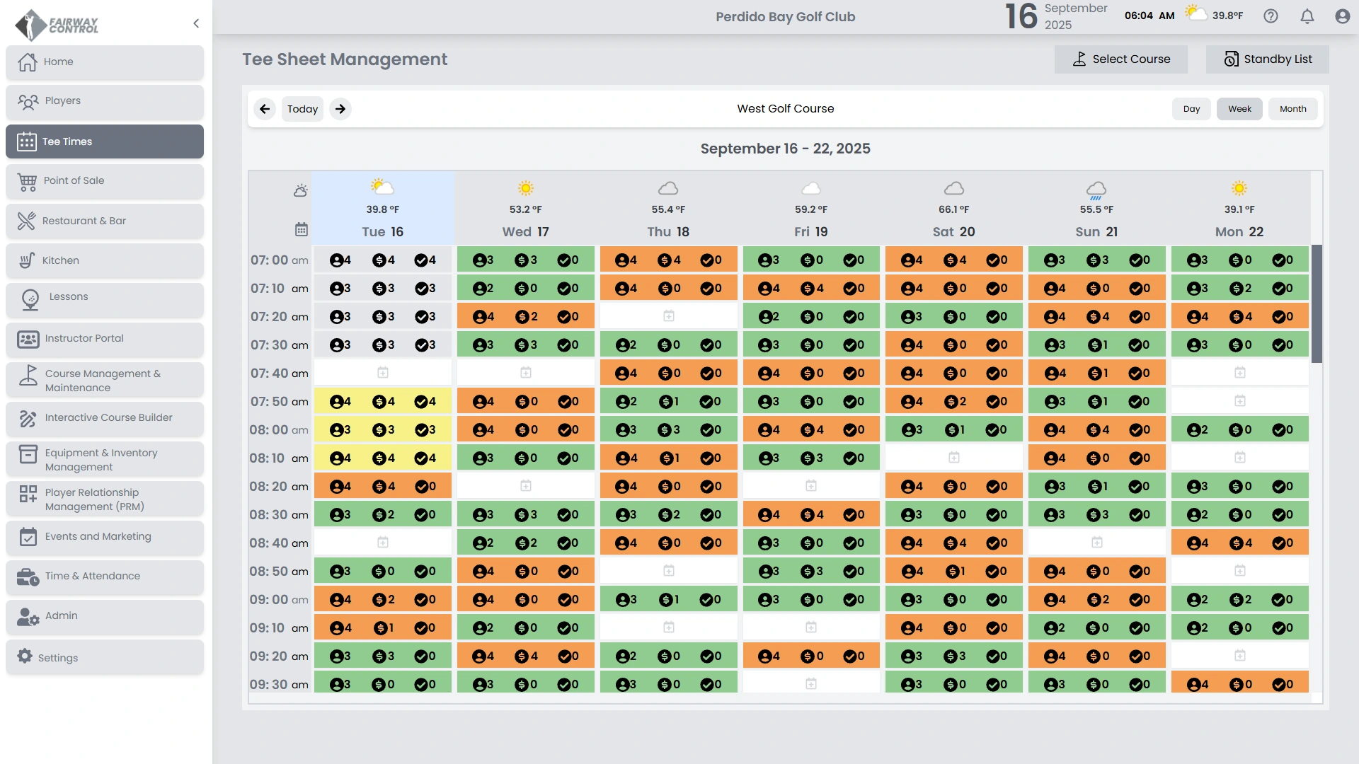 Keep every round organized using live scheduling tools, integrated weather tracking, and a built-in standby list.